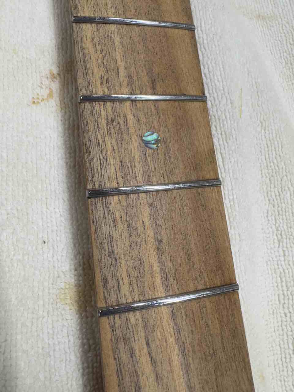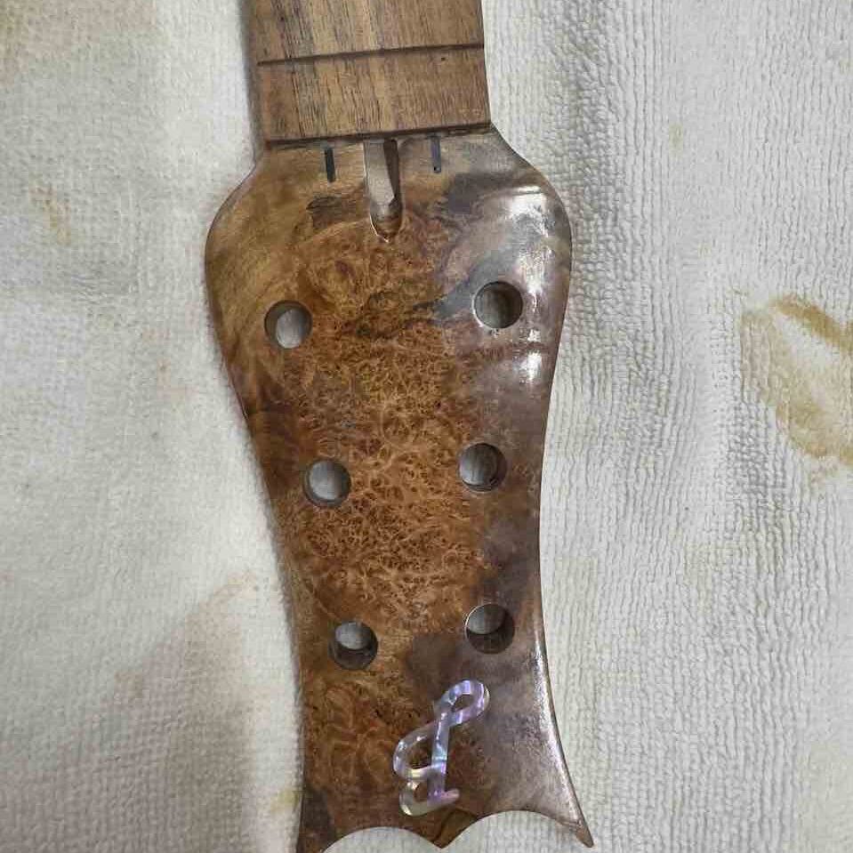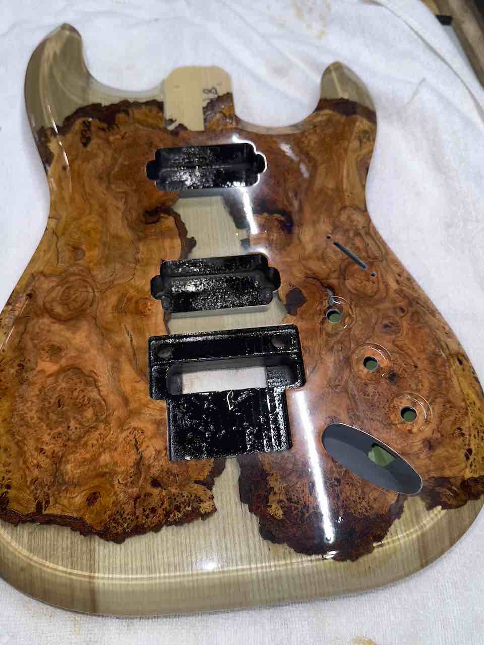 Cherry Burl body on ash with Goncalo Alves back with clear resin.  The body is top coated in Gloss Polyurethane.  Neck is a 5 piece maple and Goncalo Alves with a burl headstock. Fretboard is Patagonian Rosewood.